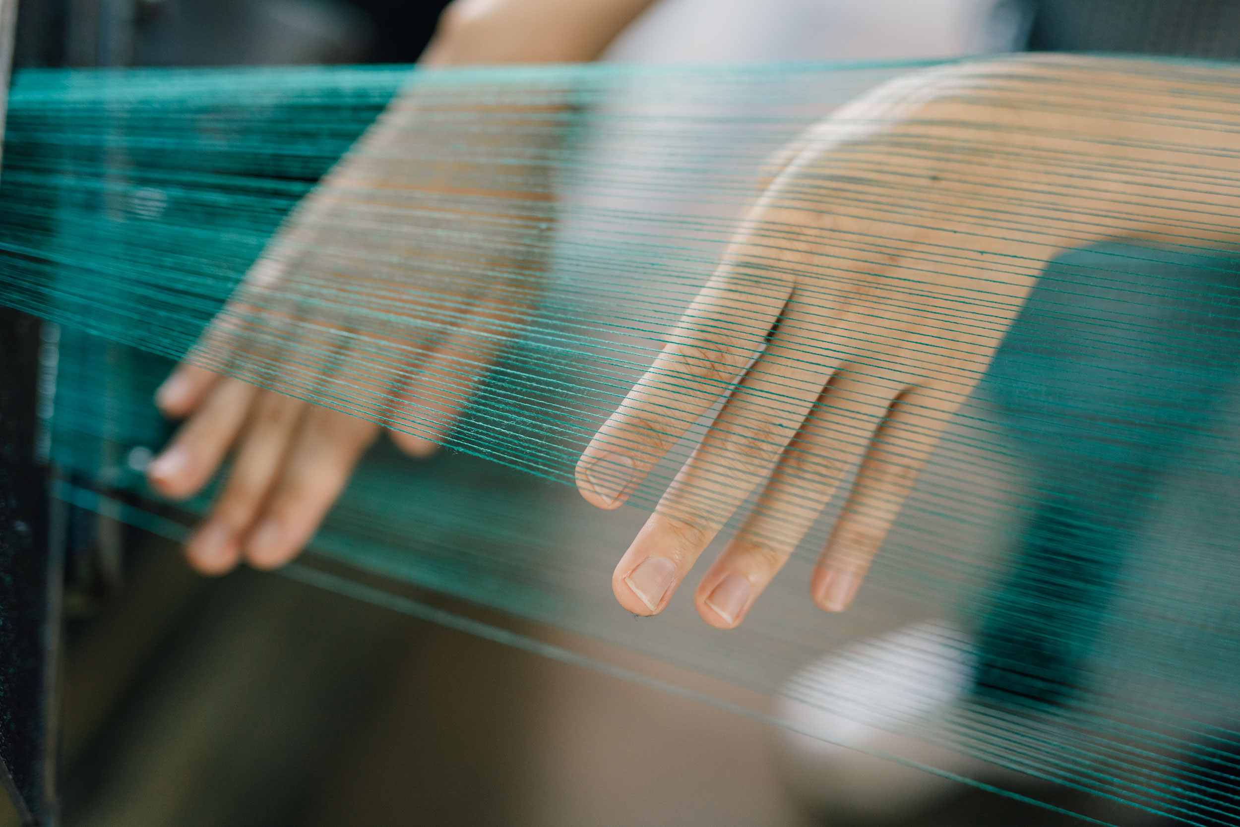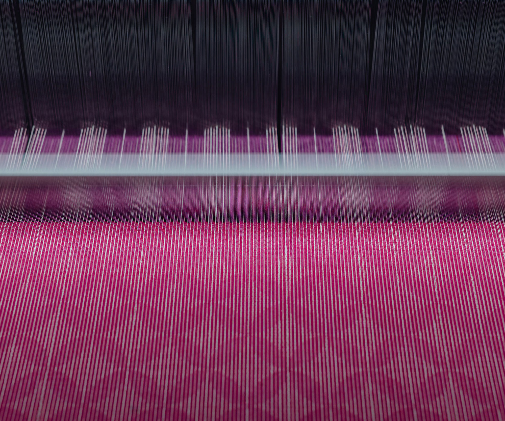 高度な職人技術によって、織機の枠を操作しながら立体的な模様を作るドビー織、